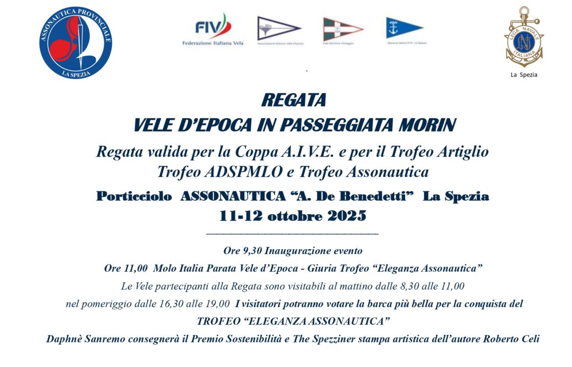 11 Ottobre 2024Iniziative REGATA VELE D’EPOCA ALLA MORIN Porticciolo Assonautica A. De Benedetti 12-13 Ottobre 2024
